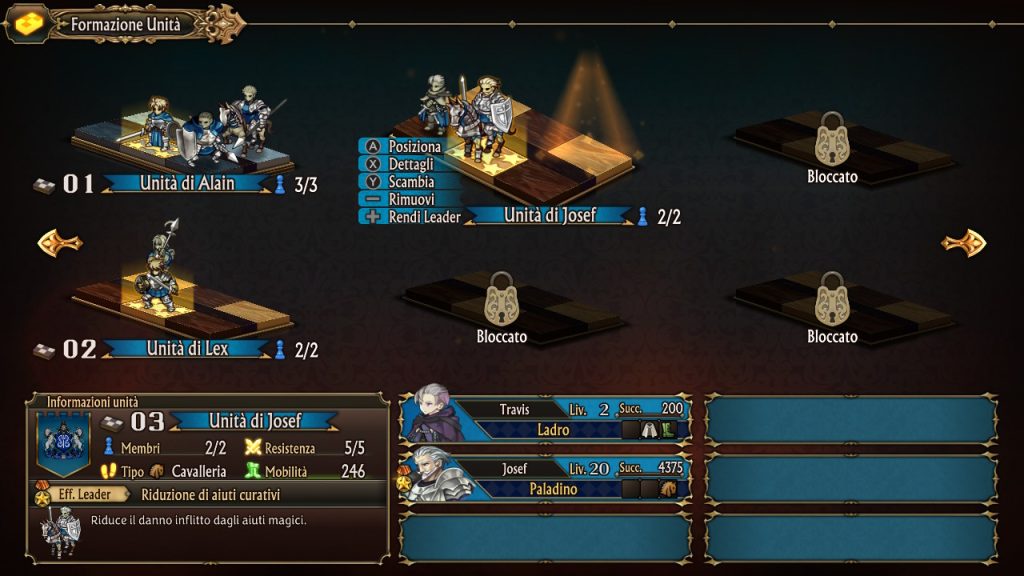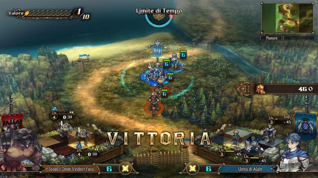 Per ogni livello da affrontare troverete delle postazioni da conquistare e dei nemici che una volta avviato il livello si muoveranno in autonomia per contrastarvi, il tutto però può essere messo in pausa per consentirvi di fare i vari accorgimenti (ed ecco spiegato il “quasi in tempo reale”). Dalle postazioni proprie potrete schierare le vostre unità che formeranno dei gruppi e da questi gruppi potrete decidere poi la formazione sul campo di battaglia, battaglia che avverrà in automatico. La formazione si dispone, almeno per ora, su una specie di scacchiera composta da 2 file di 3 posti e in base alla specialità delle unità potrete trarne maggiore vantaggio posizionandoli in prima linea o nelle retrovie. Una volta conquistata una zona sarà possibile esplorarla, trovare oggetti sparsi qua e là, andare al villaggio per fare compere, potenziarvi al vostro forte e parlare coi personaggi in giro per la mappa. Per potenziarvi oltre all’equipaggiamento, spendendo oro, il forte vi permetterà di aggiungere unità alla vostra formazione, che parte con soli 2 membri, spendendo “medaglie”. Questa valuta la si acquisisce conquistando zone e completando delle sfide tra cui le consegne che serviranno al ripristino del villaggio di zona. C’è un terzo fattore che si acquisisce con queste dinamiche ed è la “fama”, per ora non ho ben capito a cosa servirà ma credo che andrà a condizionare un sistema di scelte nel quale mi sono imbattuto solo poche volte fino ad ora. Durante la sessione di conquista potrete utilizzare le abilità attive specifiche delle varie unità utilizzando “valore” che si ottiene vincendo ogni singola battaglia. Queste abilità possono influenzare non solo la formazione di appartenenza dell’unità dove viene attivata ma anche le altre vicino a questa, oppure ci si può assicurare danno pre-battaglia contro le formazioni nemiche.
